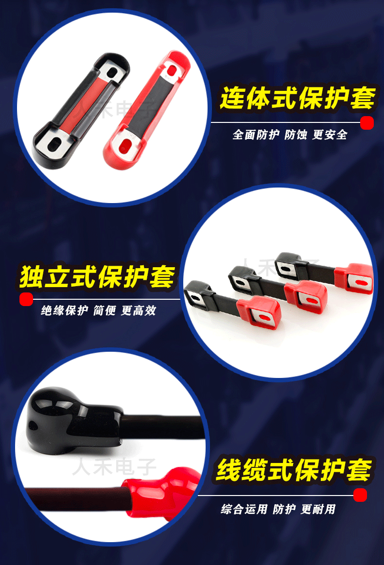 獨立式母排保護套,安裝拆卸便捷,采用進口環保阻燃材料,具備防水防塵、絕緣耐腐蝕的特點。其表面光滑且富有韌性,一體成型,整體穩定耐用,不易破損。銅排PVC護套規格齊全,并支持定制,適用于各種銅排接線連接保護。人禾電子擁有20余年的浸塑加工經驗,確保產品質量全程可控,品質有保障。